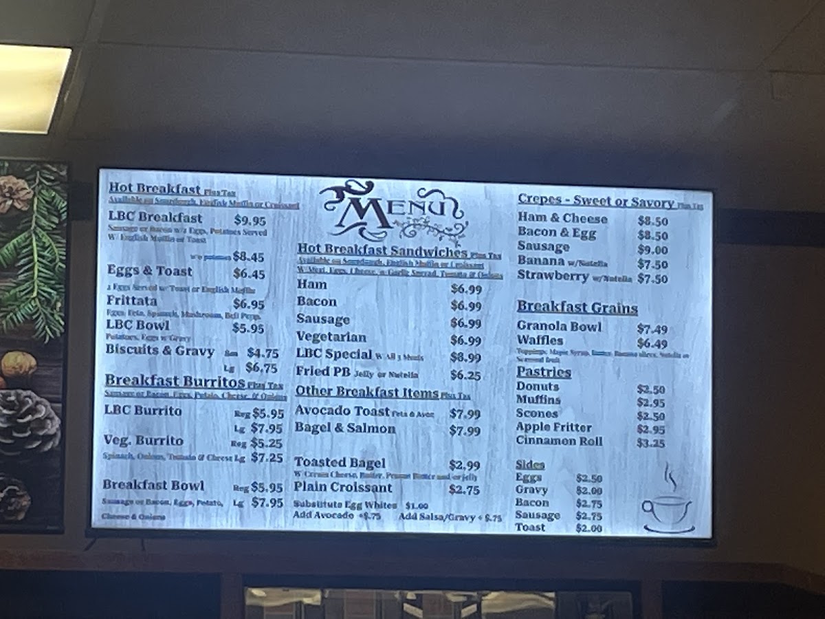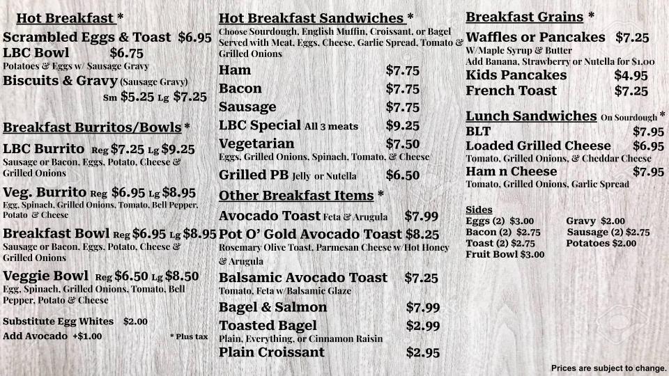 The breakfast options here are a standout, featuring classics like Eggs with Toast, LBC Bowl with savory pork sausage gravy, and their much-loved Biscuits and Gravy. For those on the go, the Breakfast Sandwich offers a choice of meats atop grilled breads, while vegetarian options are also available.